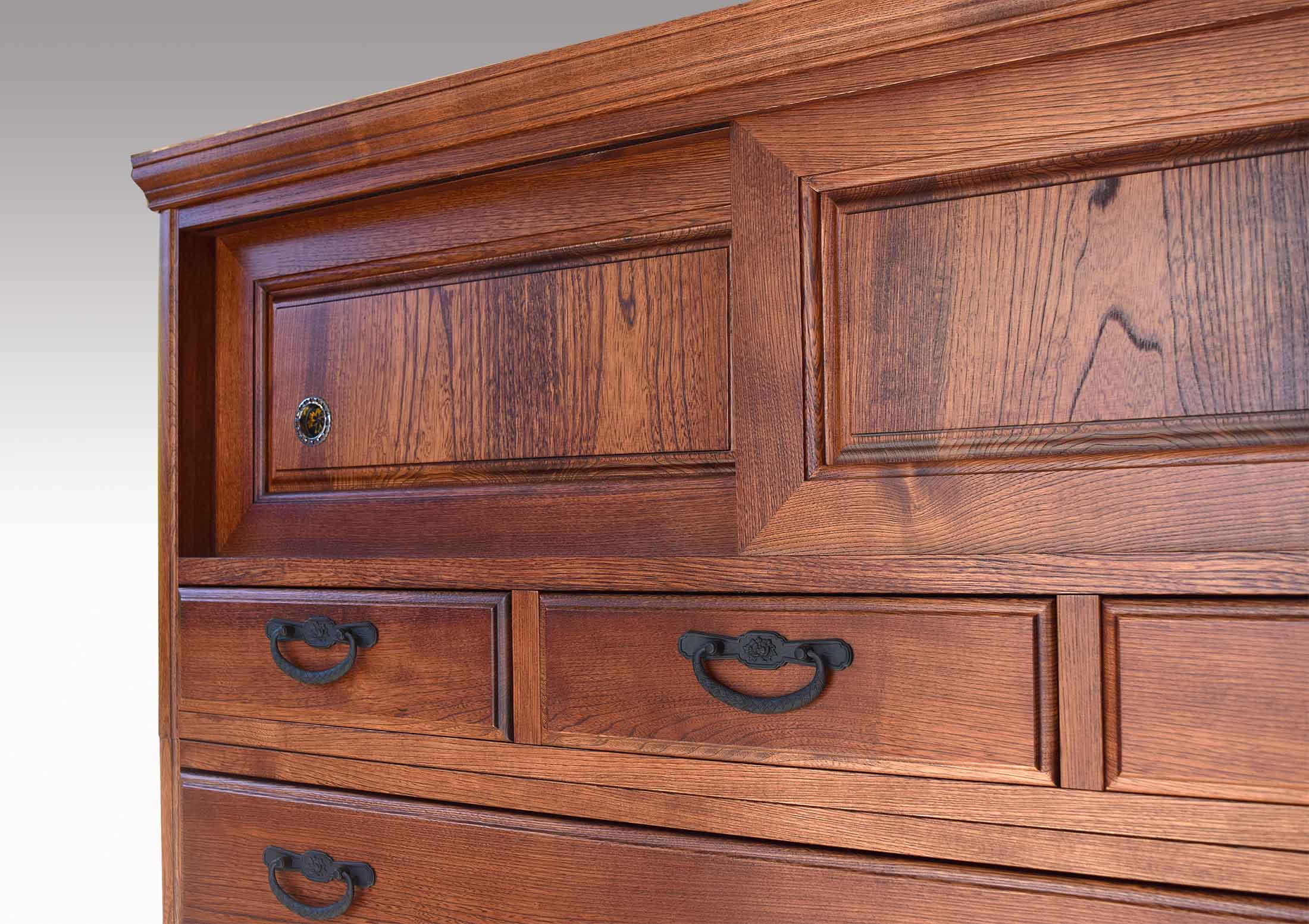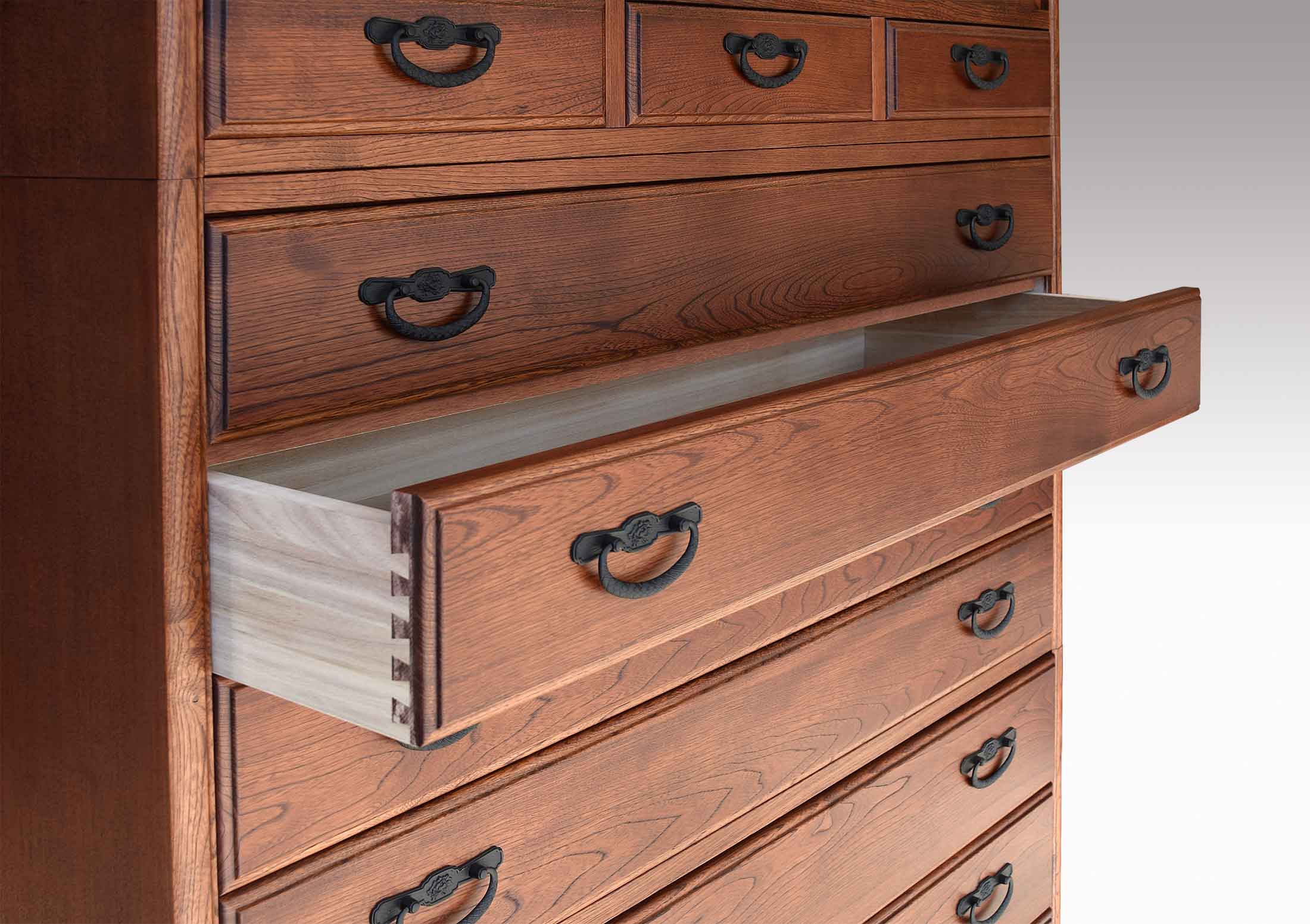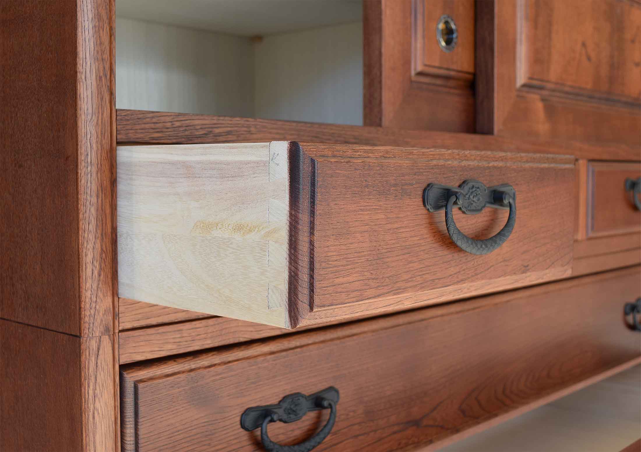 着物専用の和箪笥ですので引出の気密性は格別で、湿気・カビから衣類を大切に守ります。前板は一枚板をぜいたくに使い、伝統的技法の蟻組加工で組み上げていますので頑丈です。