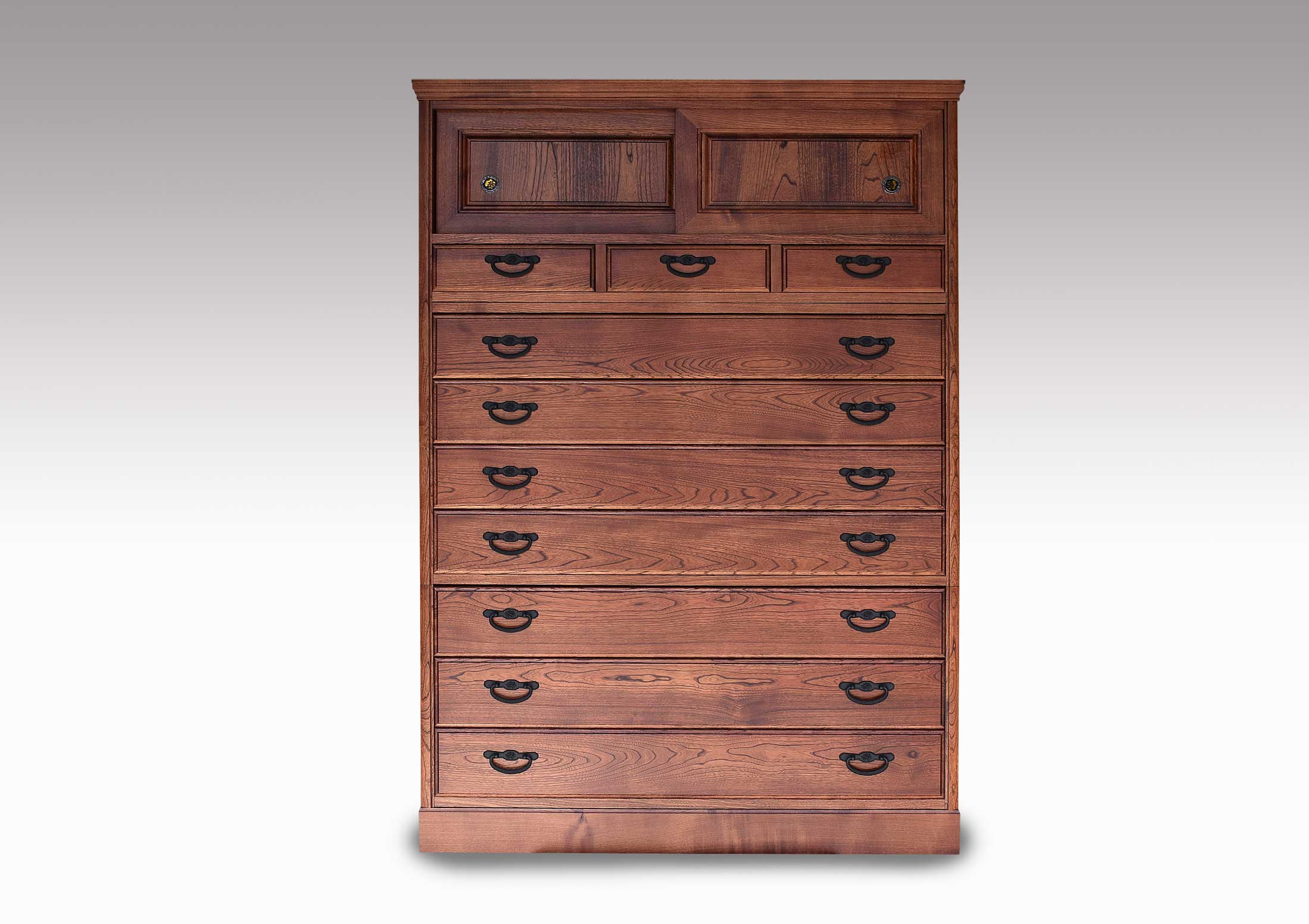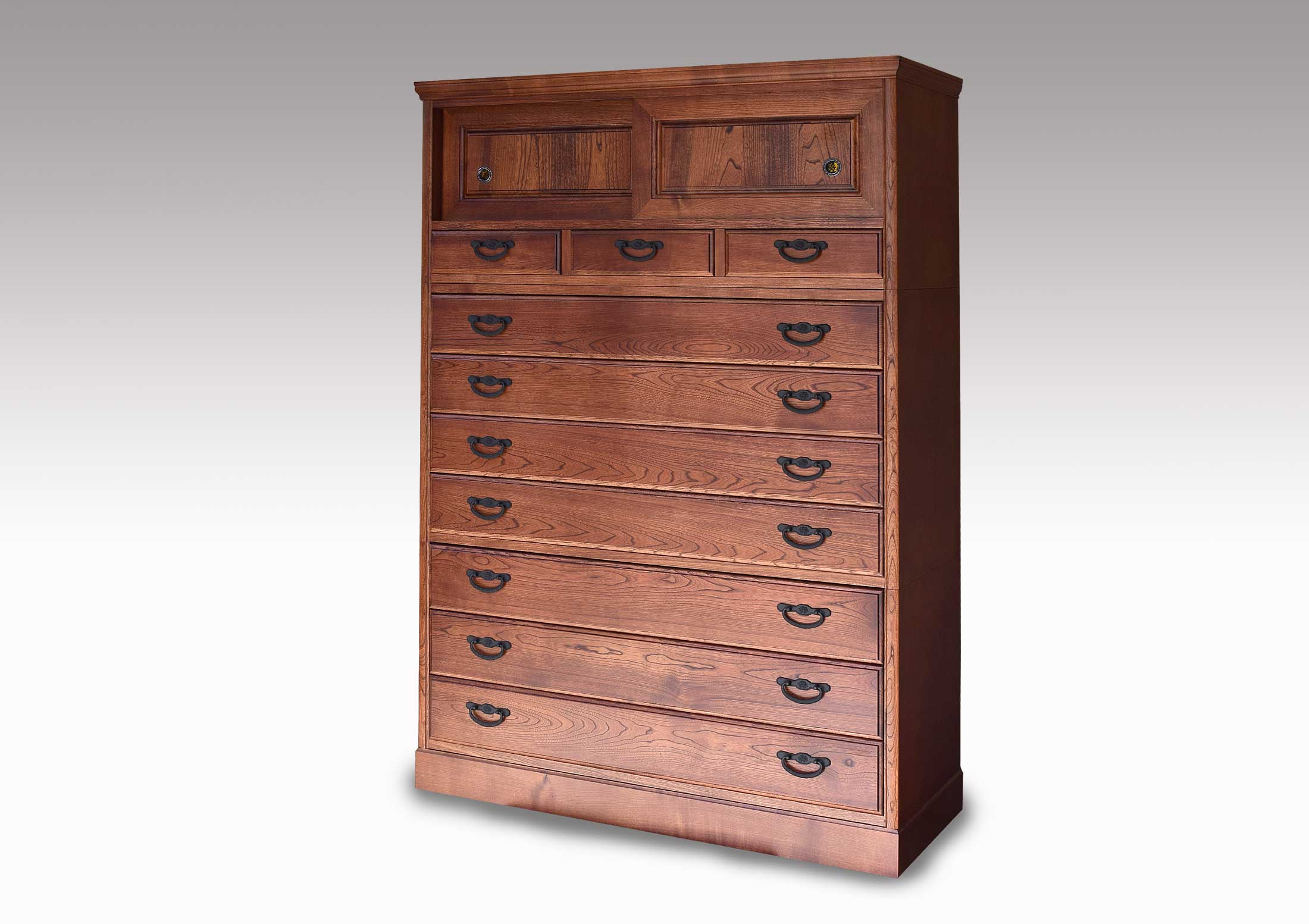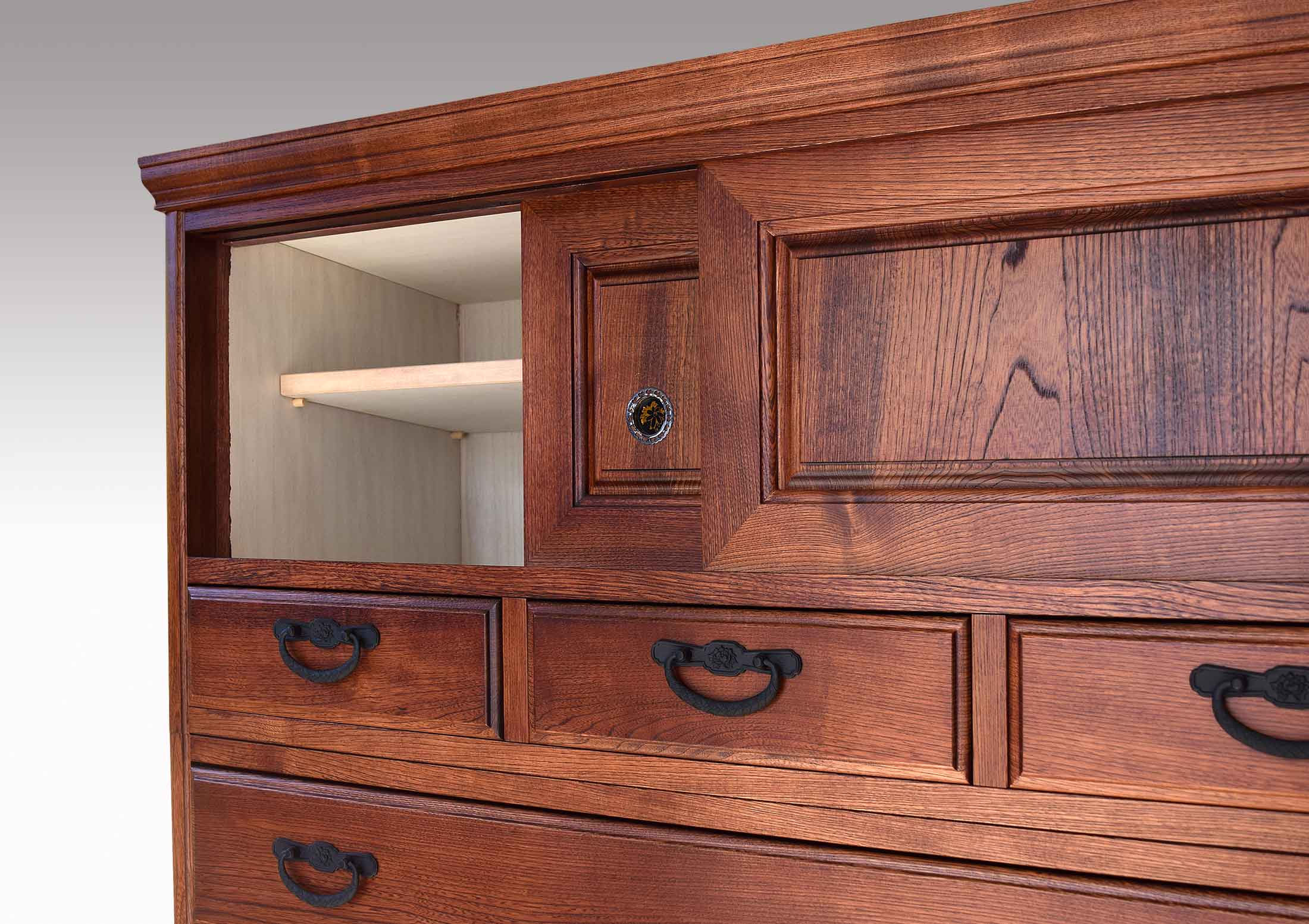 着物専用の和箪笥ですので引出の気密性は格別で、湿気・カビから衣類を大切に守ります。前板は一枚板をぜいたくに使い、伝統的技法の蟻組加工で組み上げていますので頑丈です。