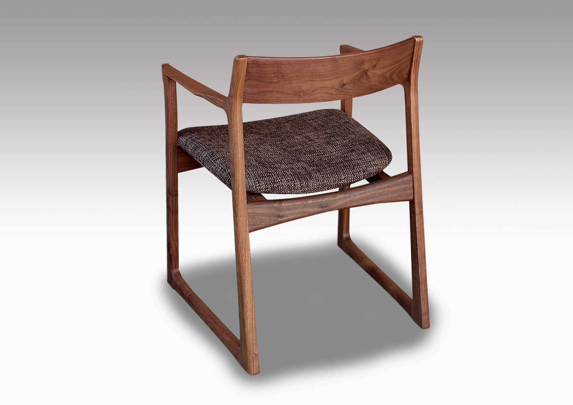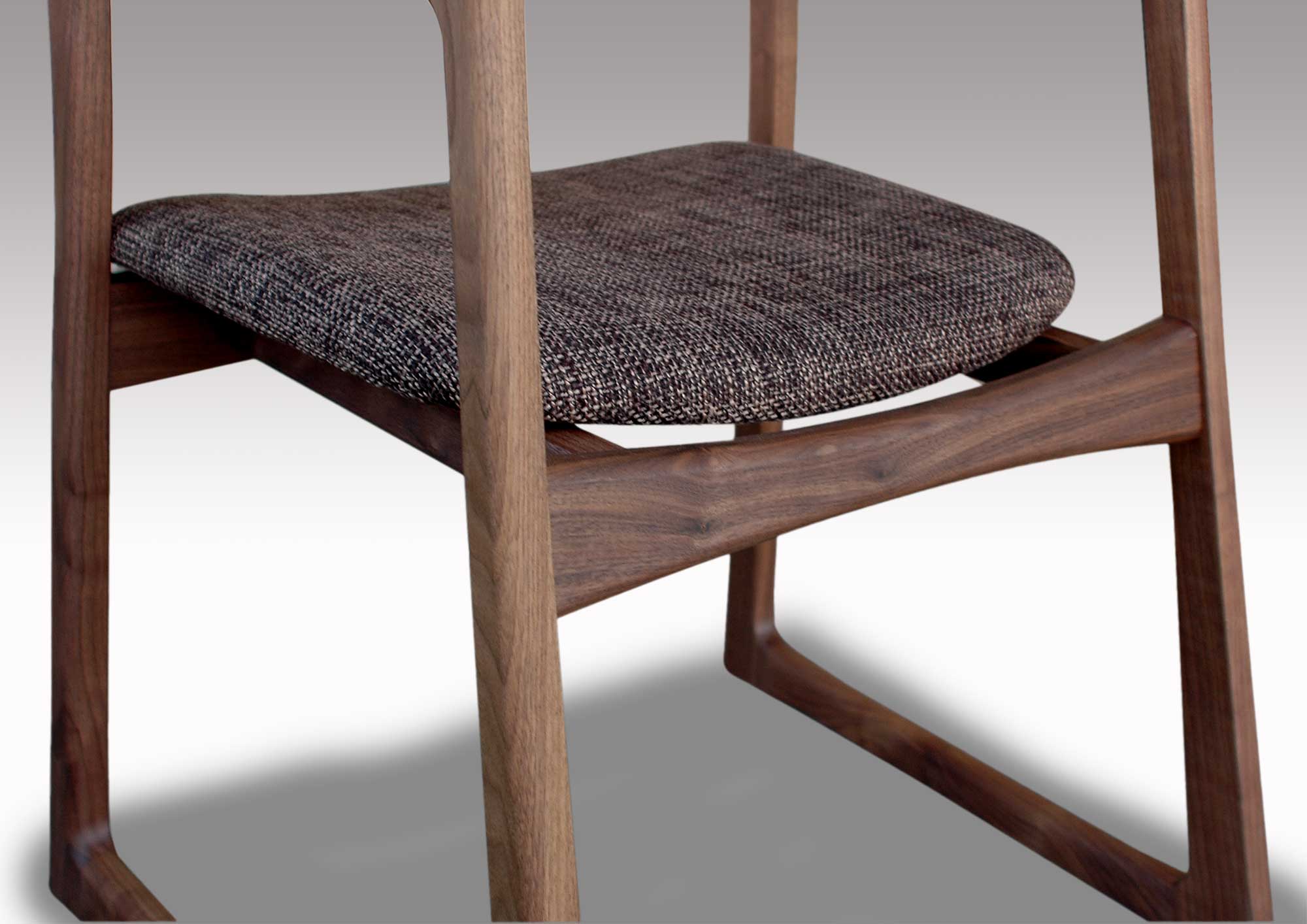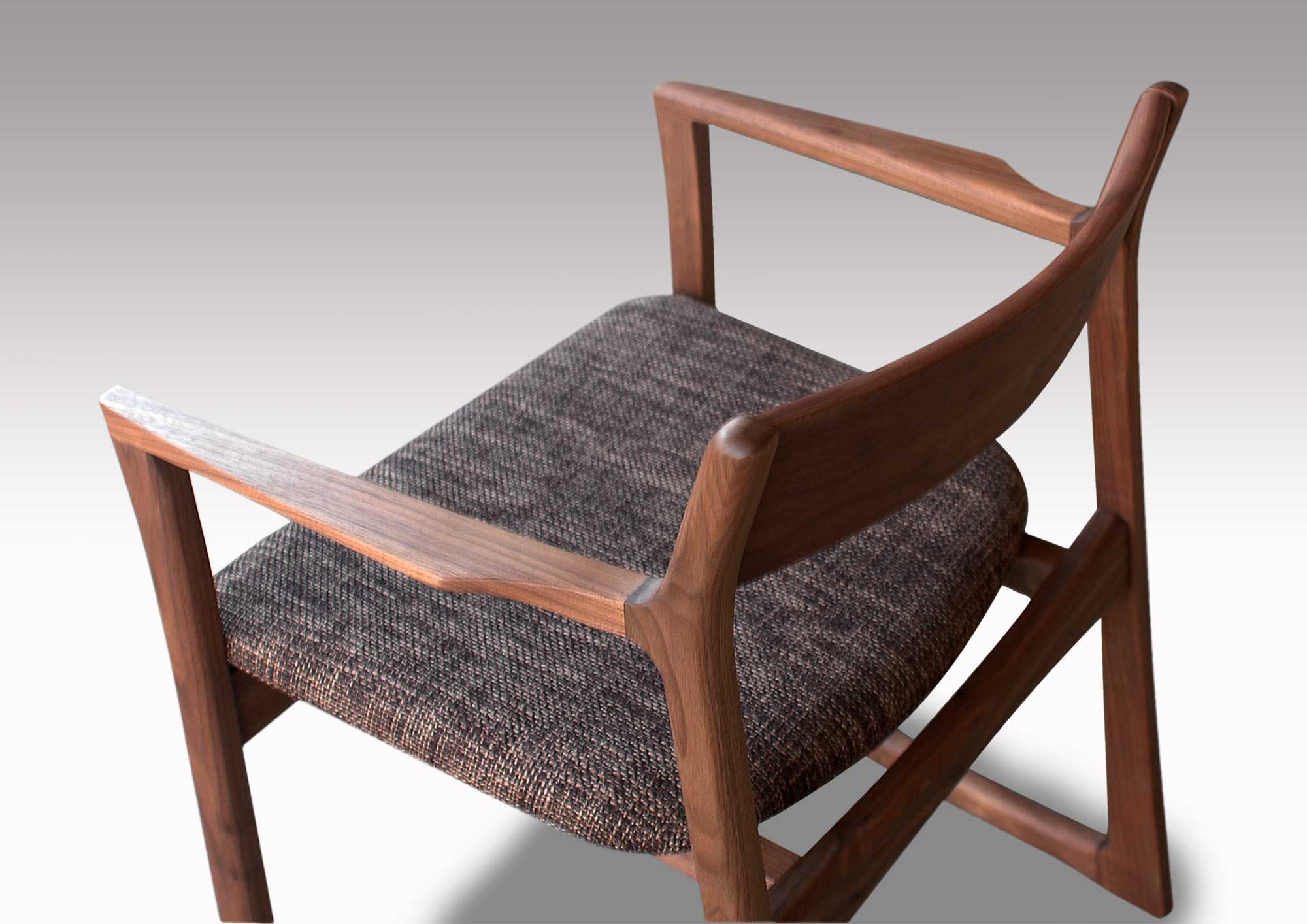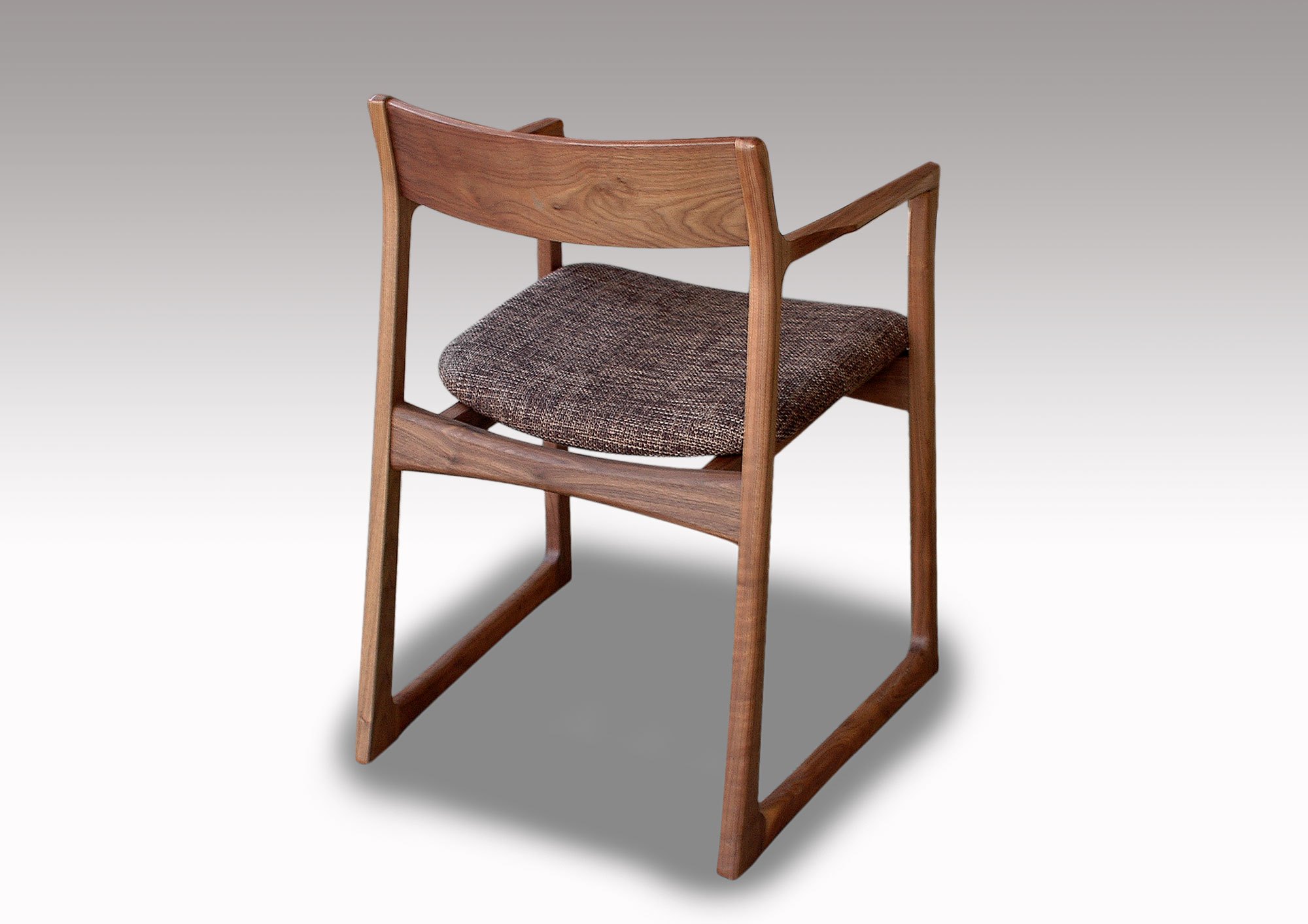 軽快なイメージのチェアーです。無垢材を柔らかなカーブに削り出したフォルムは細身ですが、木の味わいがたっぷりです。背板は曲げ木の無垢板で、安楽な座り心地、ゆったりとくつろげます。どんなテイストの空間にも違和感なく溶け込み、誰からも愛される、そんなウォールナット無垢材のダイニングチェアです。