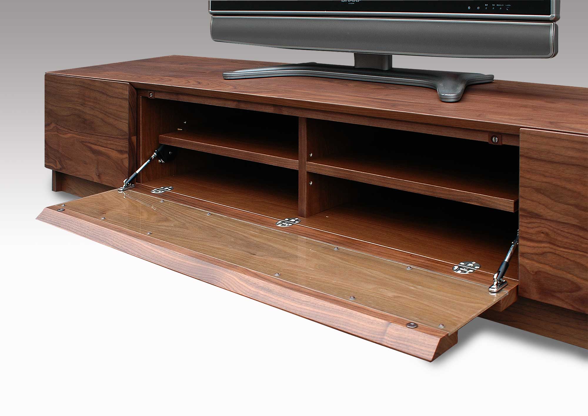 デッキ収納部分の扉は、ガラスにウォールナット材を加工していますので扉を閉めたままでもリモコン操作をすることが可能です。