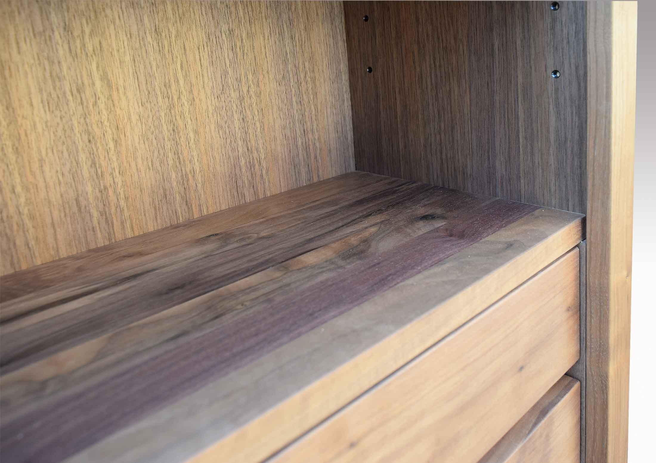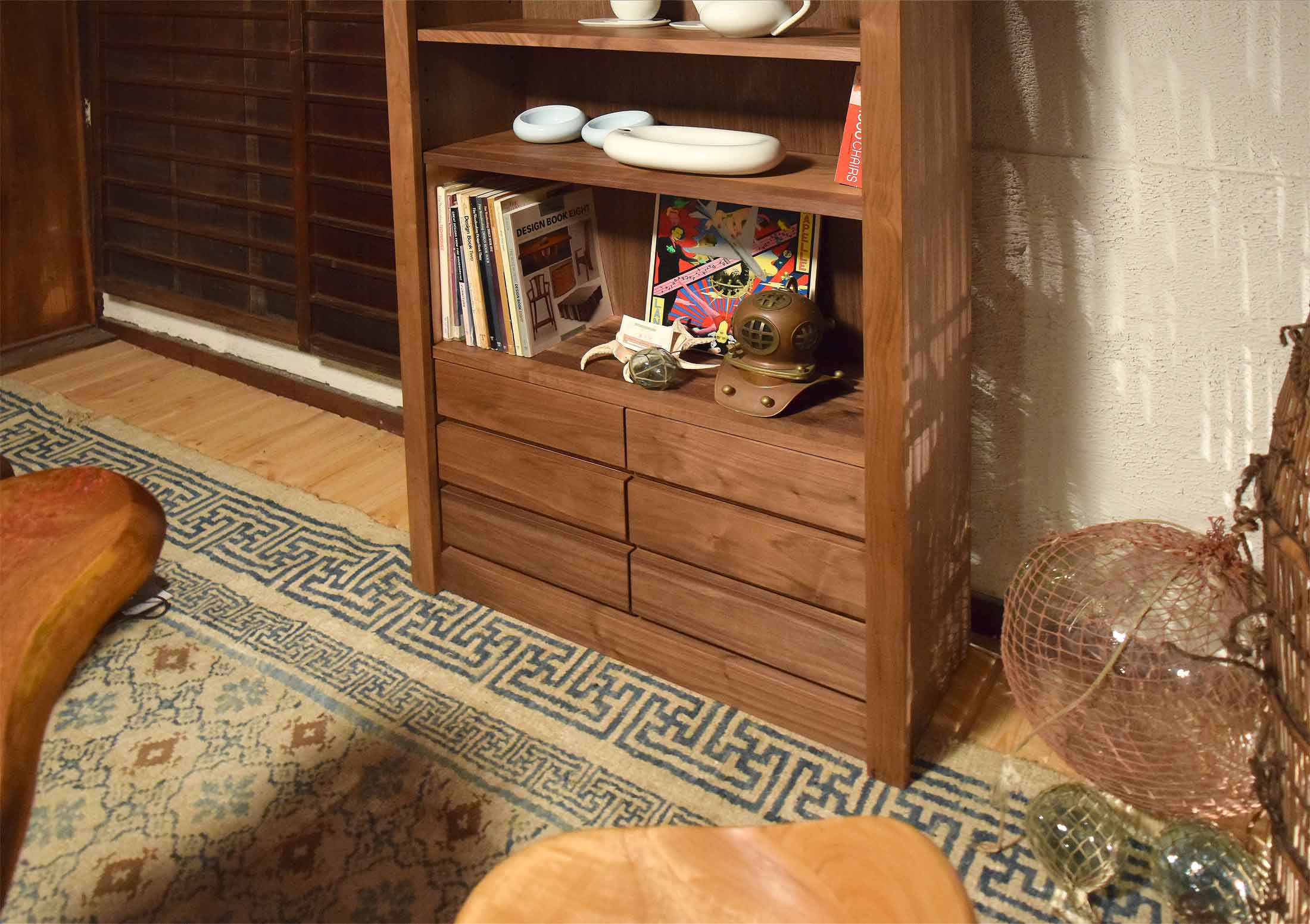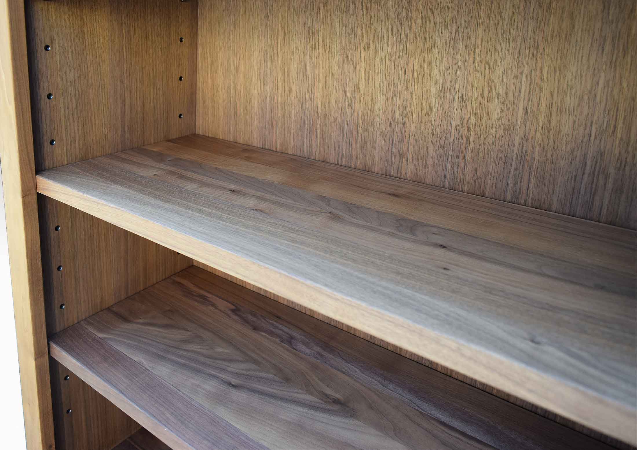 1. ウォールナット材の無垢板を全面・棚板・天板・中段棚板とふんだんに使っていますので使い込むほどに味わいが増してきます。