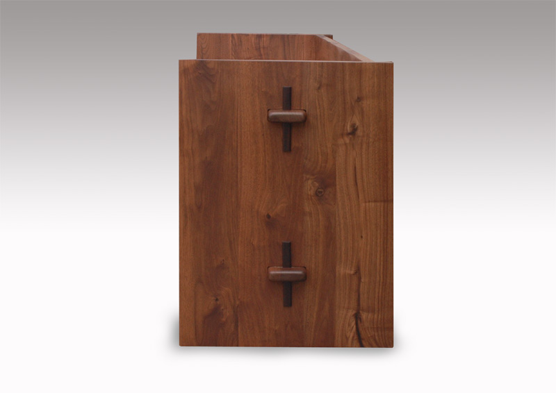 今、大人気の北米産の素材、ウォールナット・ホワイトオーク・ブラックチェリー材をおしみなくふんだんに使用しておりますので、持った時の重量はズッシリ重たく、風格が全然違います。色々な家具を配達しますが、頑丈な家具・作りにこだわつた家具・厳選された素材を使った家具は、ズッシリと重たいものです。こちらの製品は、妥協をせずに素材にこだわりぬいて作った作者の心意気が、その重さにズッシリと表れていると思います。 最近の軽めのデザインの家具は見た目にはひとつひとつの線が細くてモダンな感じがしますが、頑丈さではどつしりとしたものの方が落ち着きもあり安心して使えるように思います。私の好みの問題かも知れませんが・・・・ 又、1つ1つ手作りで製作していますので、色・かたち・素材などをかえて、自分だけのこだわりの家具も オーダー可能です。 どことなく和を感じさせてくれ、自然のやすらぎを与えてくれる心温まる当店で大人気の家具で、オススメの逸品です。